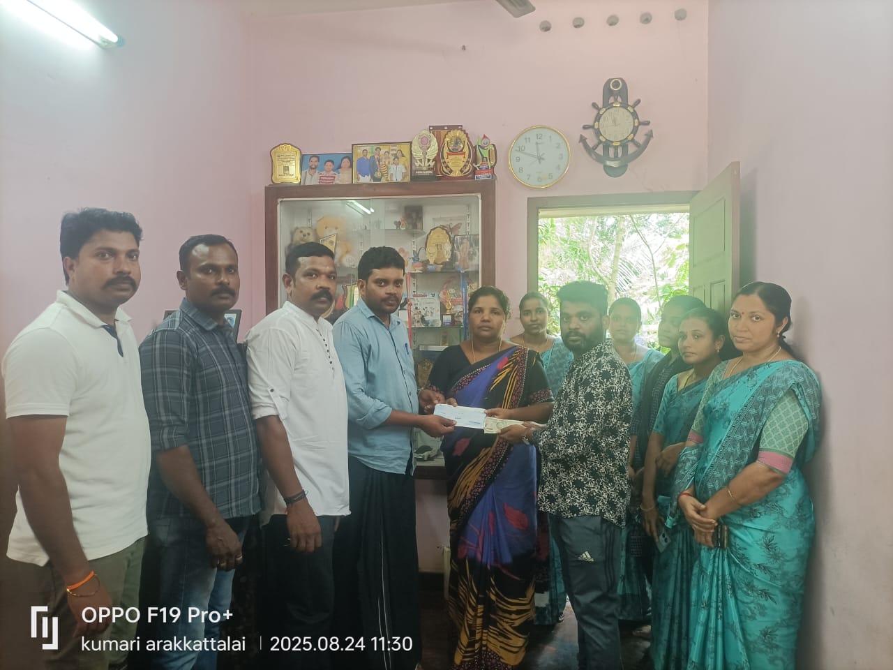 On 31-05-2025, a cheque for medical assistance of Rs. 15000/- was presented to Rajkumar, husband of Pakiya Pramila, a resident of Aralvaimozhi area, on behalf of the Kumari Arakkattalai.