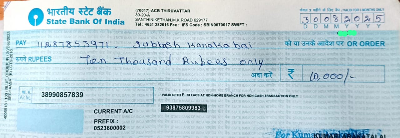 30-08-2025 Anju (95672423571), who lost her parents and grew up in the arms of her grandmother (Kanagabai) without support and belongs to Arumanai area of Kumari district, was presented with a cheque for marriage assistance of Rs. 10000/- on behalf of Kumari Arakkattalai. We are happy to inform you that.🙏🙏🙏🙏🙏🙏🙏🙏