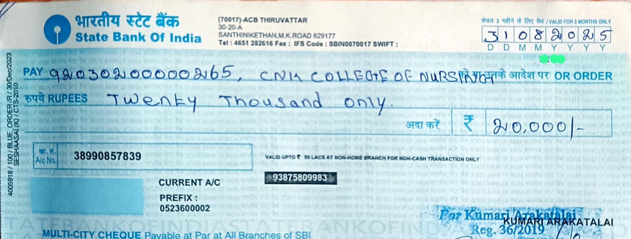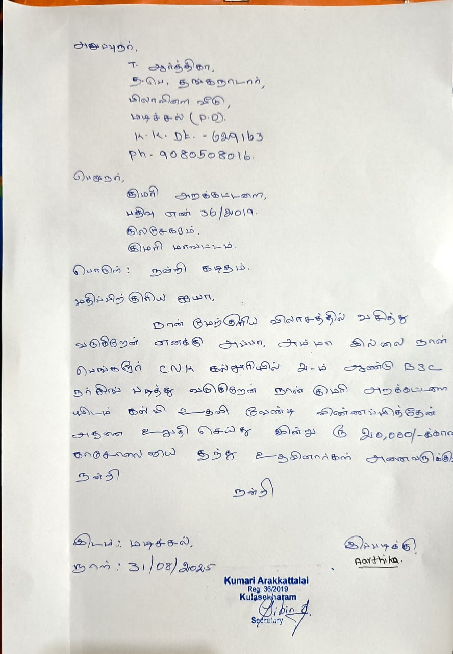 31-08-2025 We are very happy to inform you that Aartika 8807478016, who is growing up in the arms of her great-grandmother's son after losing her parents in Madichal area of Kumari district, was presented with a cheque for Rs. 20000/- for college education by Kumari Arakkattalai. 🙏🙏🙏🙏🙏🙏